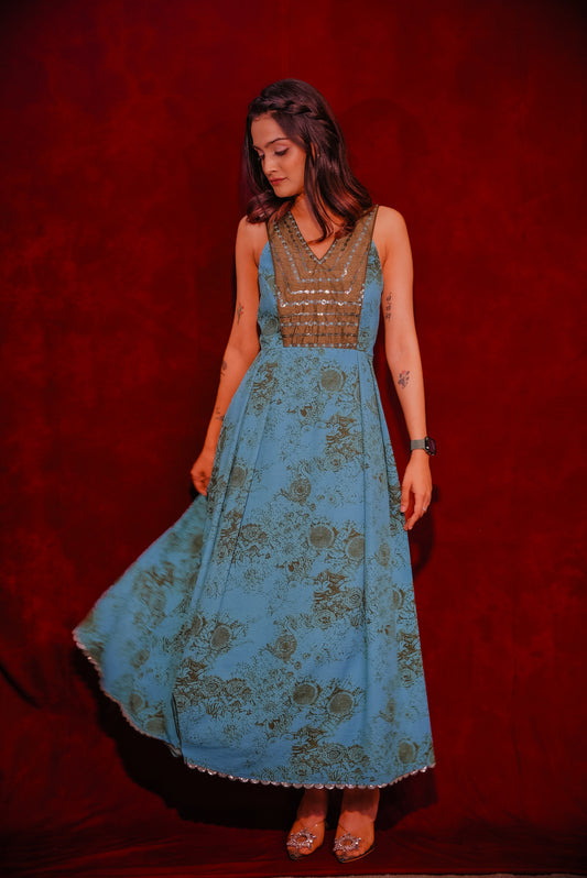 Green printed one piece with hand embroidery FABRIC: Popcorn COLOUR : Blue NO. OF COMPONENTS: 1 SIZE: As...