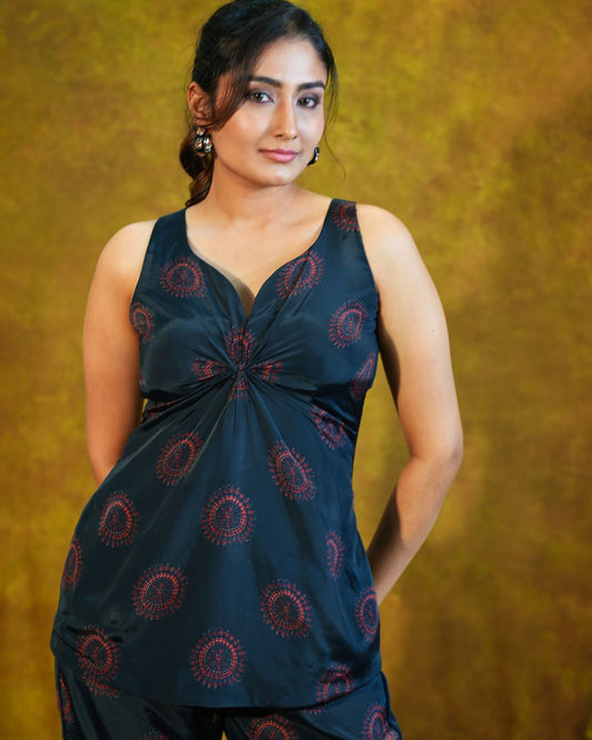 Black ajrkha printed cord-set FABRIC: Crape silk COLOUR : Black NO. OF COMPONENTS: 2 SIZE: As per customisation...