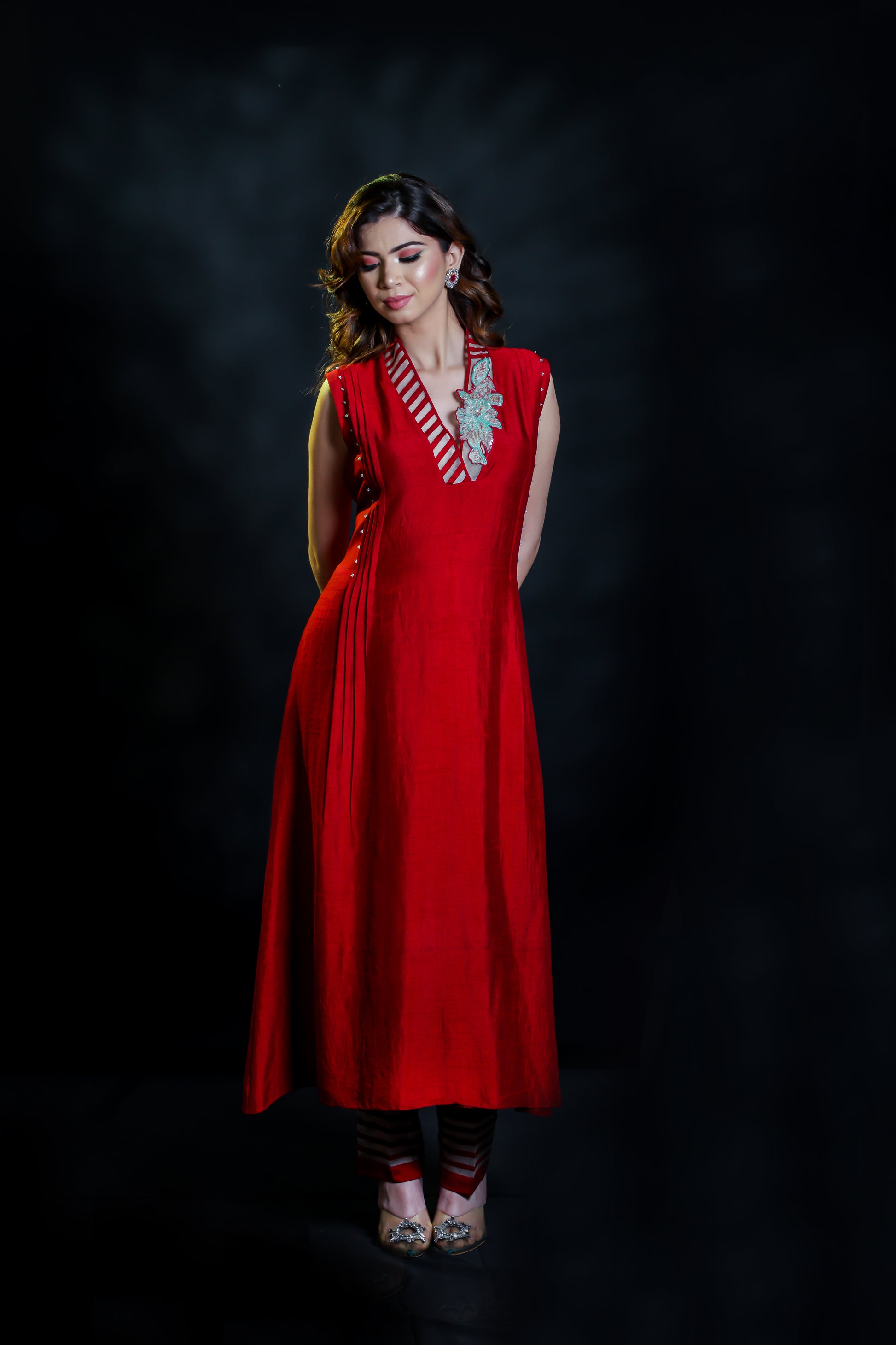 Red pleated hand embroidered dress and pant with contrast dupatta